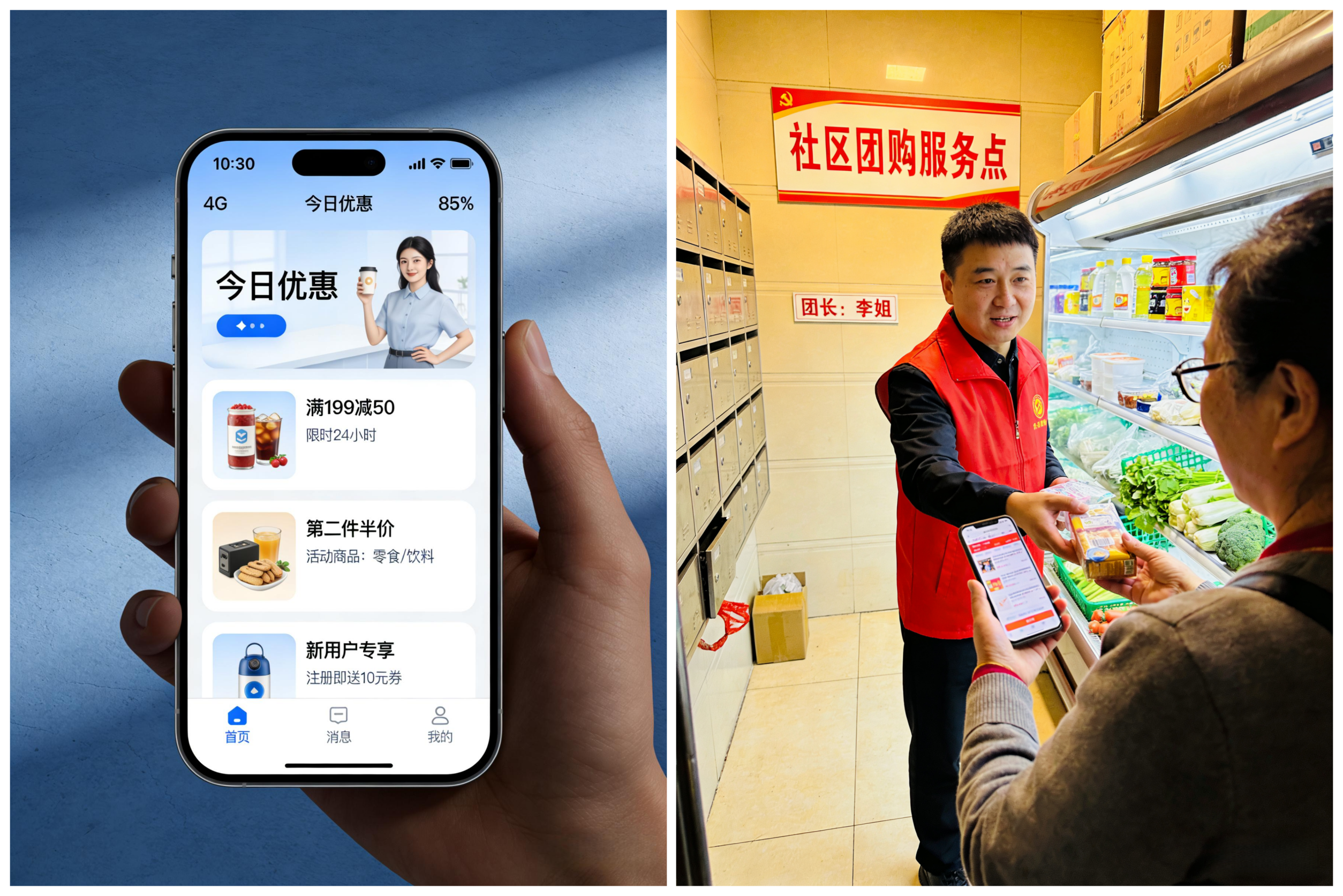 • 双渠道优惠,性价比拉满:平台生鲜拼团底价、限时秒杀、满减福利,叠加本地商家专属折扣、套餐优惠,花更少钱,享更好的商品与服务。